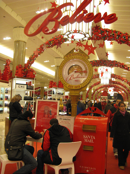 Inside Macys on the first floor there is this station where the letter that was written in the newspaper years ago with the reply that “Yes, Virginia there is a Santa Claus.” At this station you could write a letter to Santa Claus and for every letter that you stamped and mailed in their box they would contribute money to one of several charities for children. It was very cool – but while we were there there were two men writing and the children were lined up. I liked seeing the children write.