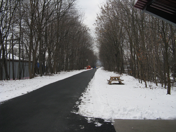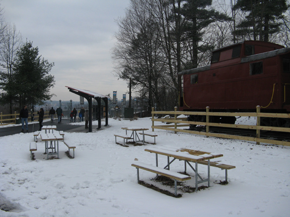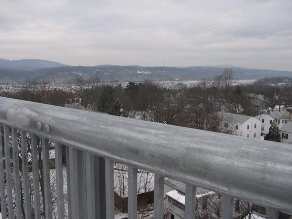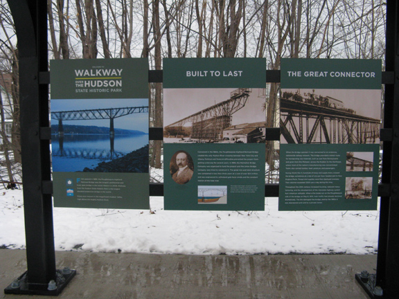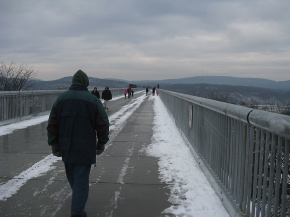 The walk from the Poughkeepsie side to the Highland side is 1.28 miles.  We walked a little slower going over as I took a number of photos and we stopped to look over the edge at the Hudson and the scenery around the bridge.  Coming back we walked much faster.  Although it was a cloudy calm day it was cold (in the mid 30s).  We were bundled up but after we had crossed over we were getting a little chilly so we walked faster coming back to warm up.  We went a little before noon and it was a perfect time as not many people were out walking when we went.  I think they were all home recovering from New Year’s Eve.  It was more crowded as we came back over.