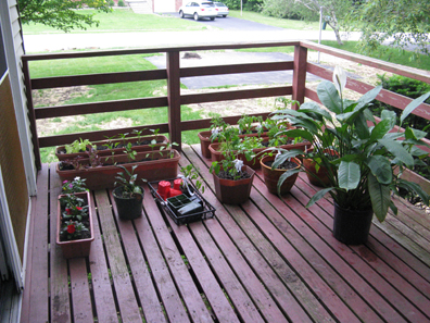 And here is the most exciting news – my new porch garden – complete with tomatoes, peppers, lettuce and herbs.  Becky sent me a hanging tomato planter but that is not hanging yet so there is one lone tomato plant waiting for a new home.  The Lape’s gave me the tomato plants.  Yeah!!!!