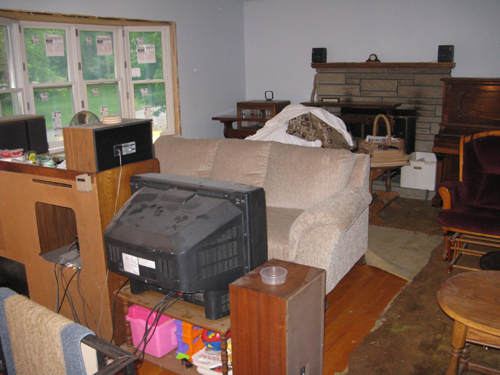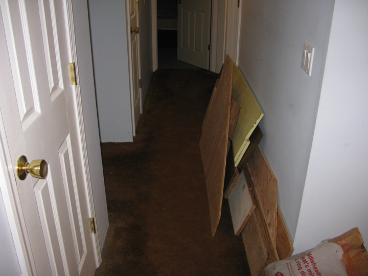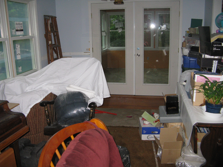 First some pictures of what we have been living with.  When Dad finished with the attic we brought down all the wood he had been using to lay on while he installed the baffles – it sat in the hallway for several days.  One night I came out of our room to get a drink and jammed my toe (the one I broke last summer) into the wood – I was more careful after that.  It doesn’t show here that I also had to step over it to get into my room.  Also here are some pictures of how we are living right now – not such a pretty picture.