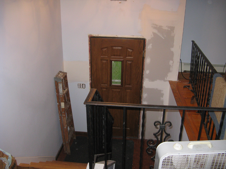 As with all our projects there is also a side project for Dad.  There has been a bump in the wall next to our front door since we moved it.  It was hidden for many years by the paneling but when the paneling came off it glared at us for years.  The man who is putting in our new wooden raining said it needed to be flat for his installation – so Dad is removing the wallboard and reinstalling it with flat wallboard.  So far we have no idea why it had the bump.