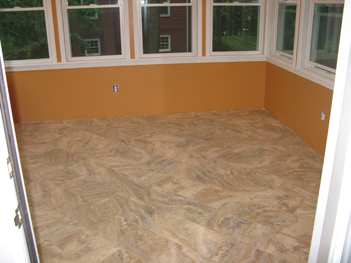 Our new sun room is amazing.  On Friday the electrician came to do most of the installation.  The fan is beautiful but he has to return as he didn’t take notes and he didn’t do exactly what we wanted – we have rocker switches throughout our house (many of which he installed when he did the electric four years ago) but he didn’t put them on the porch even though we specifically requested them.  Also, we now have a light in our attic (on a switch – very cool) but he was supposed to put in two so both sides were lit.  Anyway, here is our new fan and you can see the bright color we chose for our sun room.  Also, we laid out some of the tile (to be installed this next week) so you can see how it looks – it will be much better when it is actually installed, and yes, we are putting it at an angle.