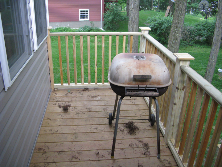 Well we are really beginning to see the end – at least for the contractor – there is still a lot of work ahead for us – a great deal of painting (living room, dining room, hall and stairs walls and all the trim throughout the upstairs), staining our new railing, and general put it all back together stuff.  Before we can paint Dad has to lift the heater coil/pipe up so the carpet will fit under it (the carpet is our almost last step in all this – the front porch fix up being the very last).  We also have some fix up stuff to do.  Dad has been busy early mornings and evenings finishing the install of our new hose for our water softener and cleaning up the garage and getting the front porch railing ready to go into the dumpster before it leaves on Friday.  He had to cup up the old railing from inside as well so it would fit easily into the dumpster.  So much to do!