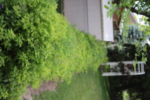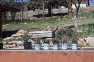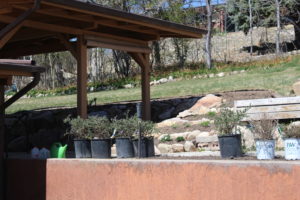 Carl then cleared the area on the bottom tier from our garden to the railroad ties and we bought Potentilla bushes (five yellow and five pink) to put in. Since they bloom all spring, summer and fall and do well in hot dry weather they are perfect for our garden here. Here they are waiting to be planted.