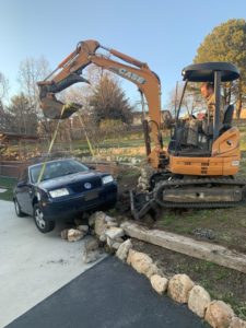 Our neighbor up the hill just happened to have a back hoe and was willing to come and lift the car off the wall so it could be moved away. The rock wall suffered as did the railroad ties but the day lilies survived.