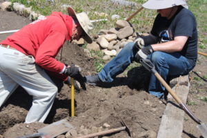 So that is what is filling all of Carl’s time right now. Today he is moving soil so we can plant our Potentilla bushes and get them going in the ground. We will not cover up the new sprinkler line until we can test it for leaks. The secondary water comes on in a week or so and so sometime after that we will test the line and if it is leak free Carl will fill it in. He plans to use some of the gravel he has dug out along the way under the pipes to give them a secure base. It is a good way to use the gravel which we have lots of. Much like New York there is no shortage of rock here and they tend to grow over time as well. The good news is that mostly of the dirt Carl is digging up is quite good for gardening and plants.